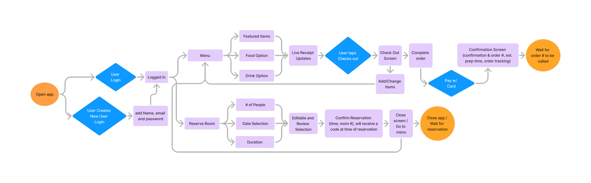 Creating an user flow allowed for easy understanding of the steps and experience as users navigate the app. By having these steps mapped out it helped layout the necessary steps within the app and any potential challenges to optimize the layout and interface.