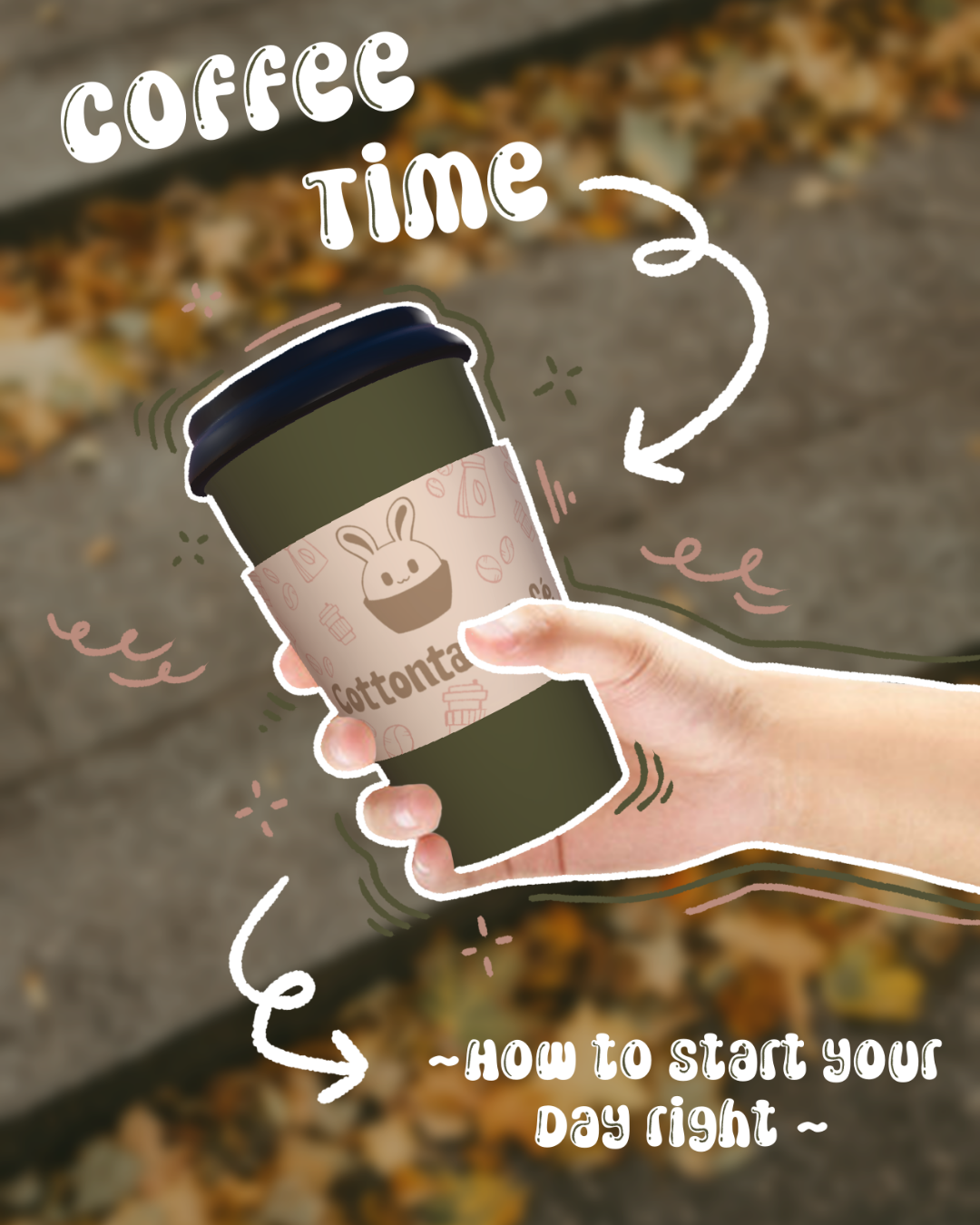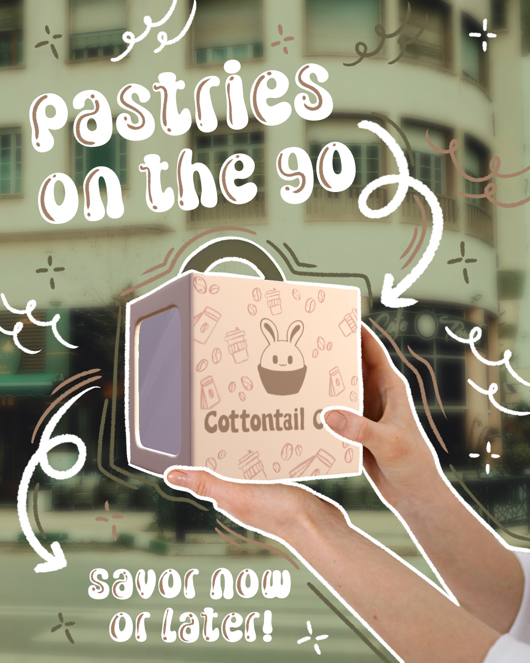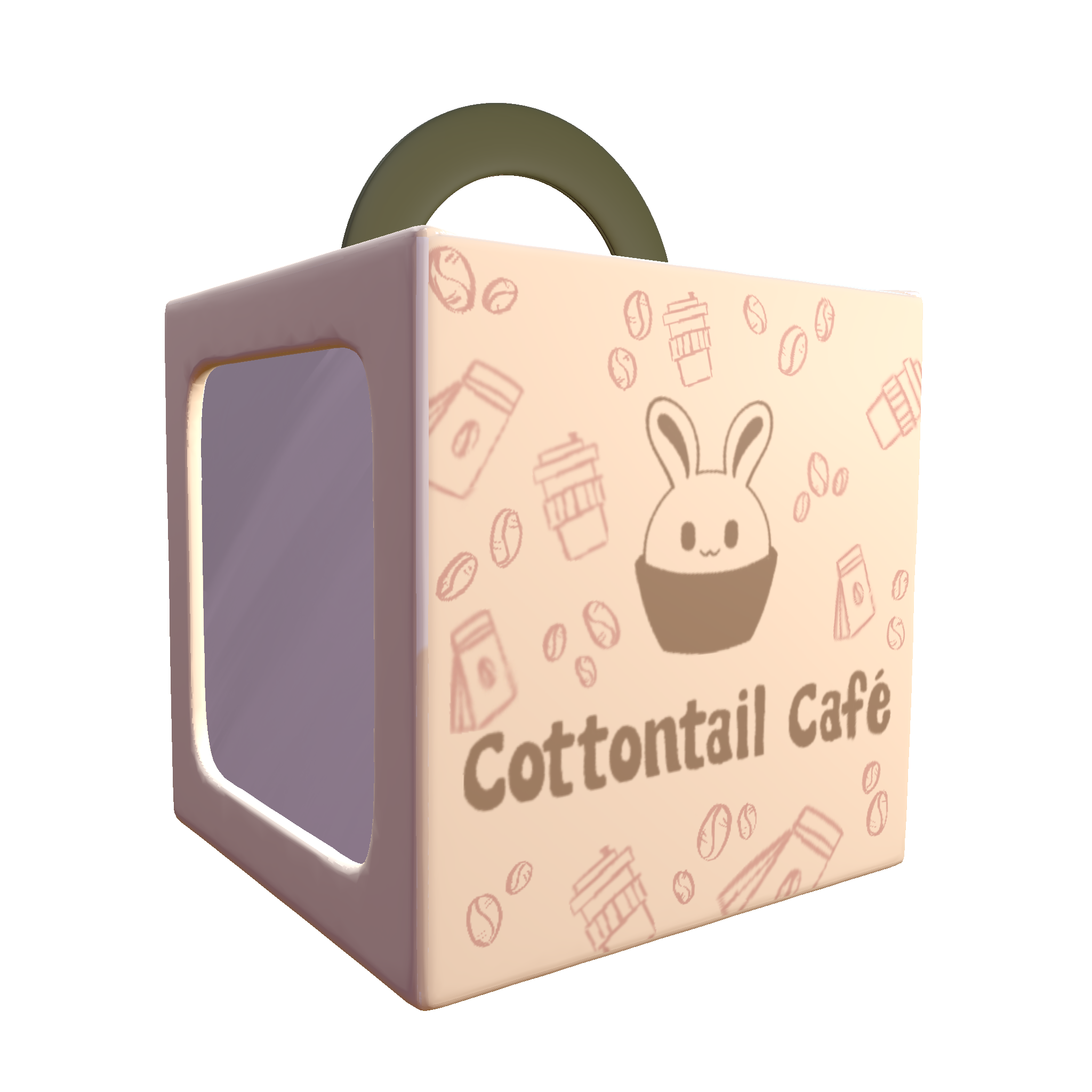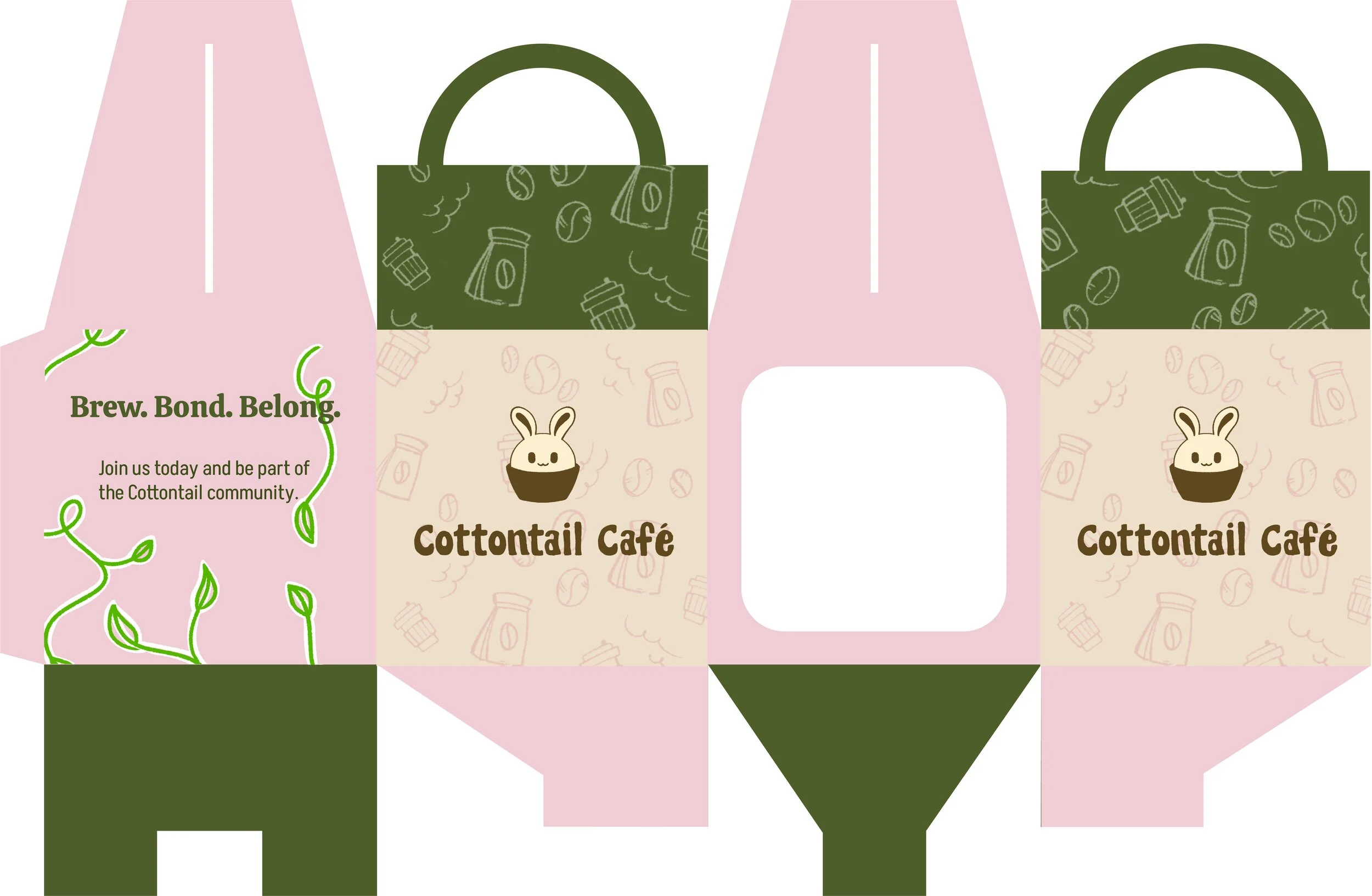 The product and print designs are crafted to complement the café's cozy and inviting aesthetic. They feature the bunny mascot, soft earthy tones, and nature-inspired elements in each design, to maintain a cohesive visual identity that enhances the café's charm.