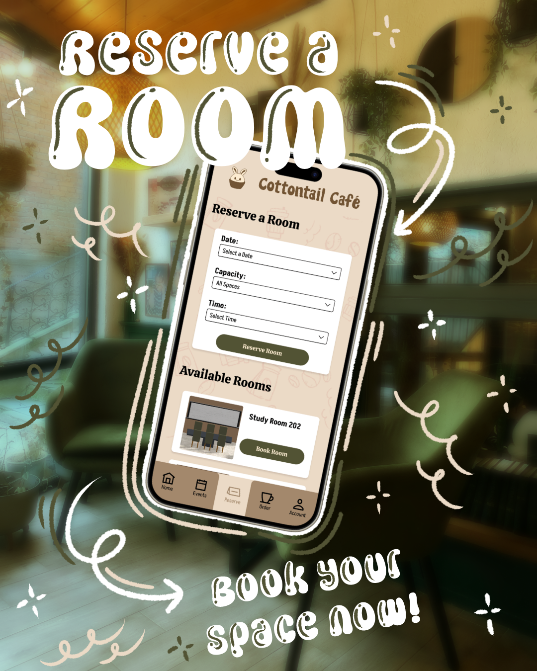 Welcome to your café on the go, our app brings the café vibe to your fingertips. You can order your favorite drinks and treats, book a private study nook, and check out all the upcoming events. Whether you’re grabbing coffee or planning your next meet-up, everything’s just a tap away.