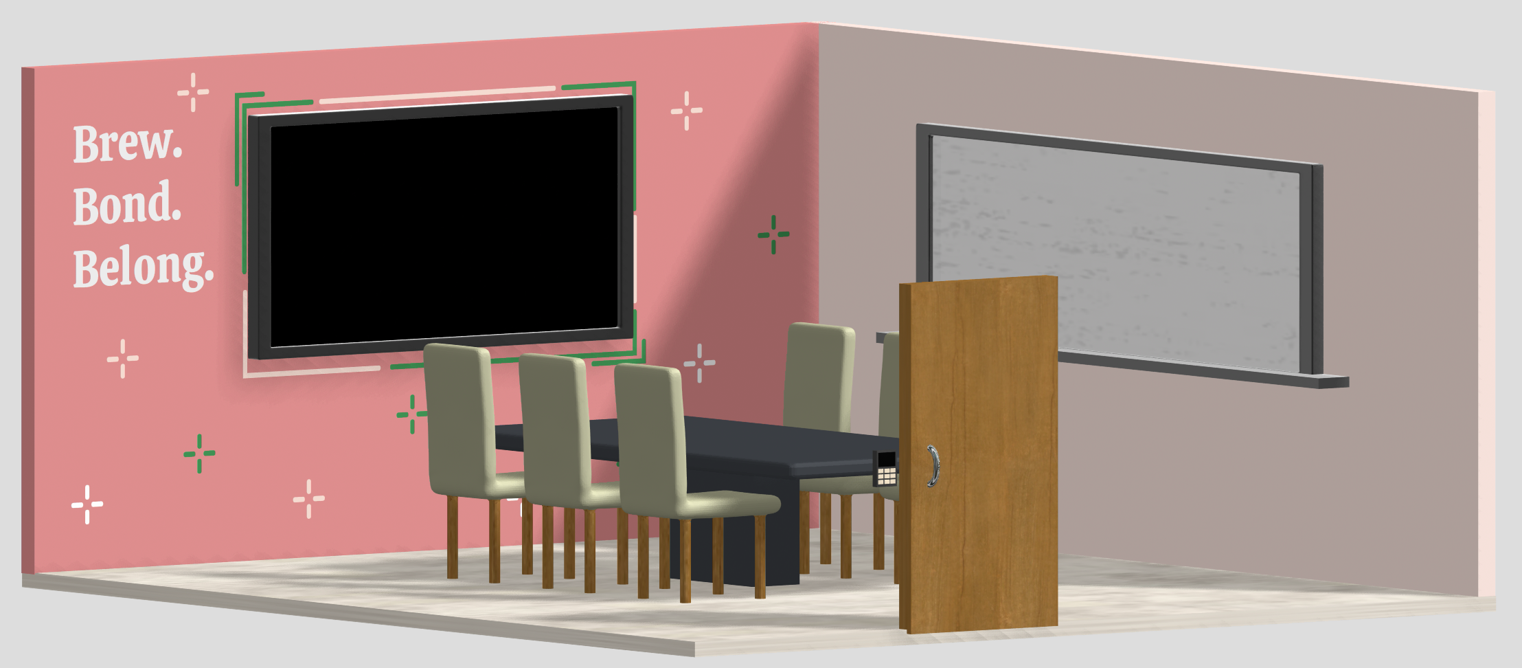 The 3D-designed study room in the café offers a cozy and semi-private retreat for friends to gather, collaborate, or unwind. Designed with warm, nature-inspired palette, the space feels both inviting and functional. Equipped with a TV for presentations or entertainment and a whiteboard that encourages brainstorming and creative discussions, the room blends comfort with productivity.